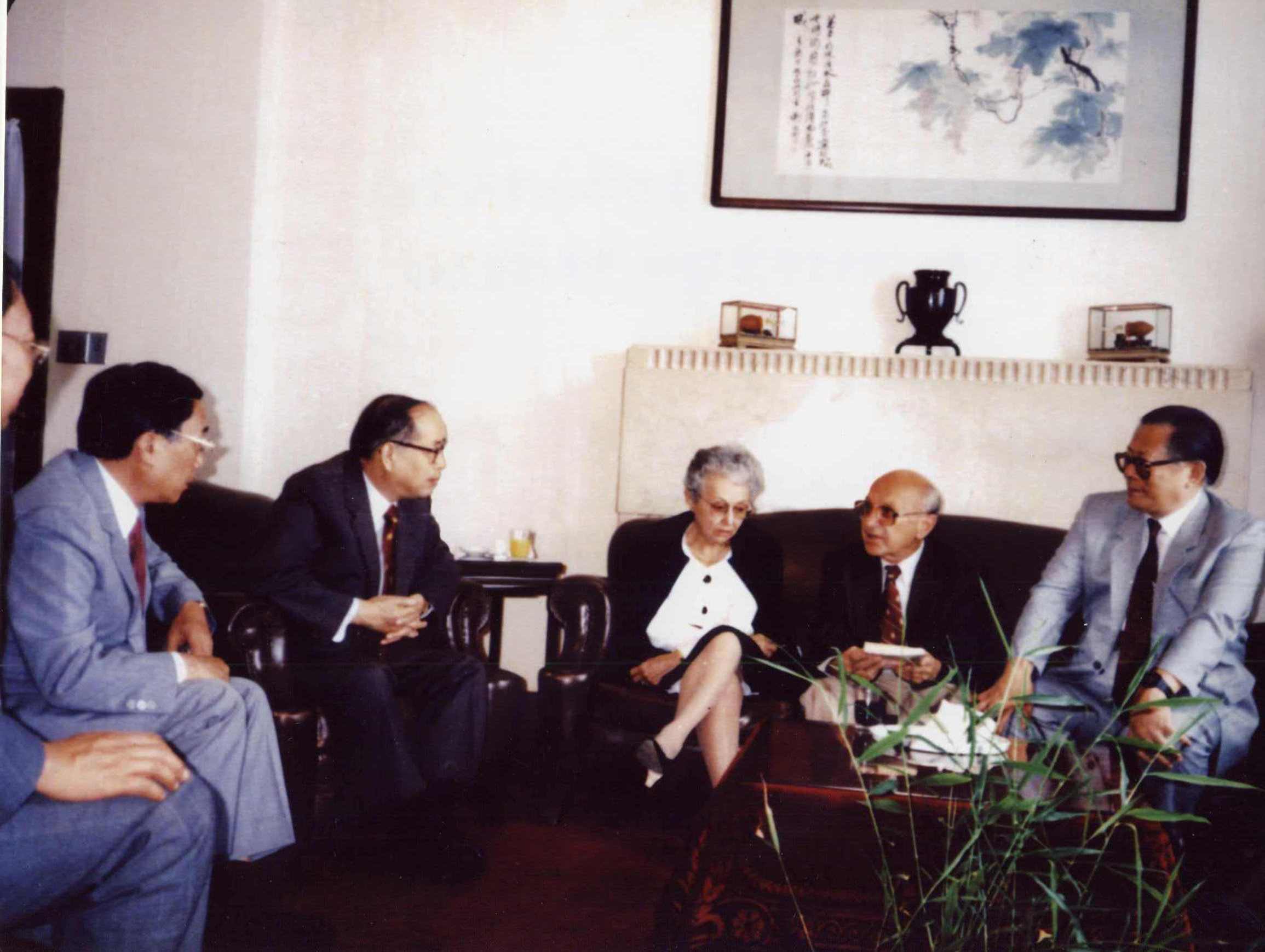 图为1987年江泽民同志与弗里德曼(右二)、陈观烈教授(左二 )(时任bat365在线登录网站注册赠送36院长)留影。