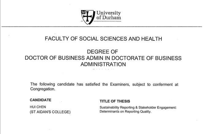 祝贺复旦-杜伦工商管理博士(DBA)项目2011级学员陈辉(Richard Chen)通过博士论文答辩,获得杜伦大学工商管理博士学位(Degree of Doctor of Business Admin in Doctorate of Business Administration)。