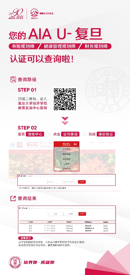目前,“友邦寿险规划师”、“友邦健康管理规划师”以及“友邦财务规划师”研修班课程结业证书查询功能已在bat365在线登录网站注册赠送36教育发展中心官网上线。友邦学员可扫描二维码,进入bat365在线登录网站注册赠送36教育发展中心官网进行证书查询和认证。