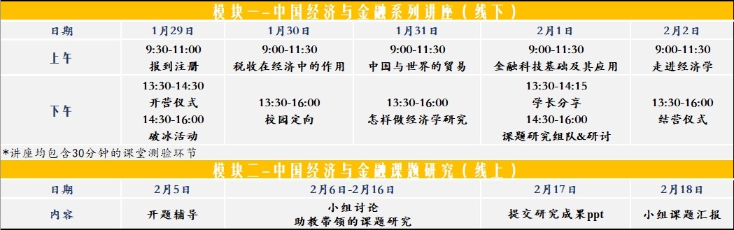 项目包含两个模块,模块一为5个中文授课的主题讲座,讲座内容紧密围绕中国当代经济、金融知识,涵盖国际贸易、国际金融、财政税收、经济学研究方法等,旨在引领高中生从经济史角度看中国的发展,了解经济学研究的思维方法,学习经济和金融入门知识,开拓全球化的经济视野与格局。模块二为“课题研究”。在“讲座”模块的基础上,鼓励完成了“讲座”模块的优秀学生继续组成课题研究汇报小组,提出自己感兴趣的经济学小问题,在经济学教授和复旦经济学在读博士生的指导下就问题的资料收集、研究的意义和研究方法以及研究预期结果进行探讨,并做小组汇报,最后由经济学教授给出点评和建议,培养初步的经济学研究意识。