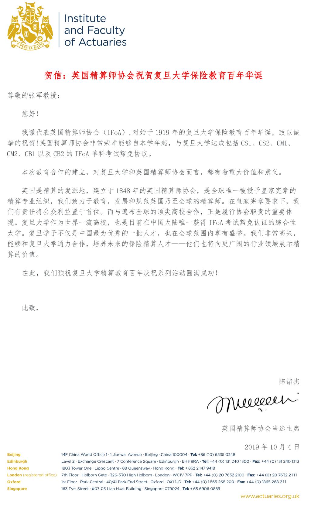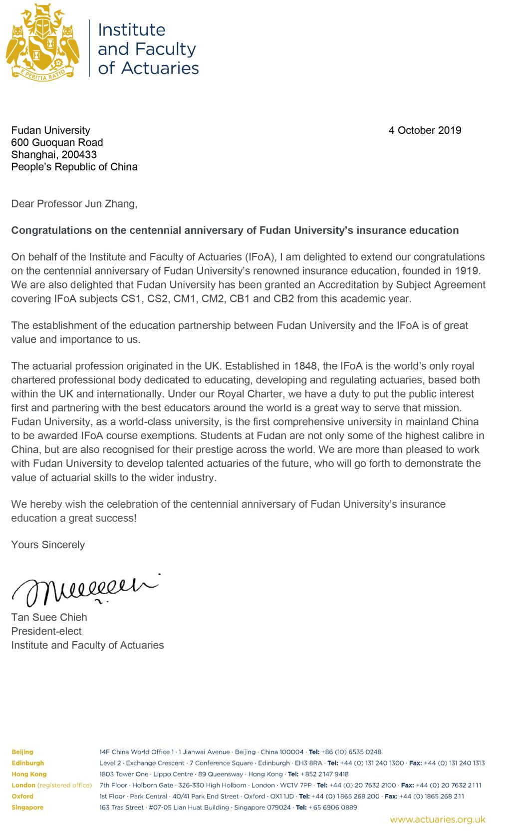 英国精算师协会(TheInstitute and Faculty of Actuaries ,简称IFoA)是全球领先的,历史最为悠久的皇家特许精算协会。前身是英格兰的精算协会和苏格兰的精算学会。IFoA 成立于1848年,其逐渐发展成为全球唯一致力于教育,发展,规范全球英国精算师的皇家特许专业组织。依据1884年授予我们的皇家宪章,其责任是把公众利益放在首位。日前,英国精算师协会给张军院长发来贺信,对始于1919年的复旦大学保险教育百年华诞,致以诚挚的祝贺!