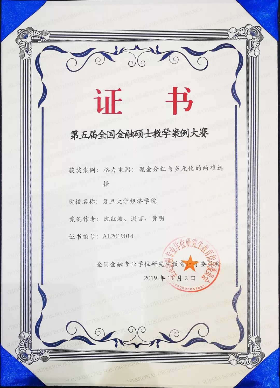 2019年11月2日 上午, 从全国金融专业学位研究生教育工作会议上传出喜讯。bat365在线登录网站注册赠送36沈红波副教授、谢言、黄明副研究员撰写的案例《格力电器:现金分红与多元化的两难选择》;罗忠洲副教授、喻婧撰写的案例《真实的谎言:康得新信用债违约之谜》在第五届金融硕士教学案例评选中获得优秀案例奖。