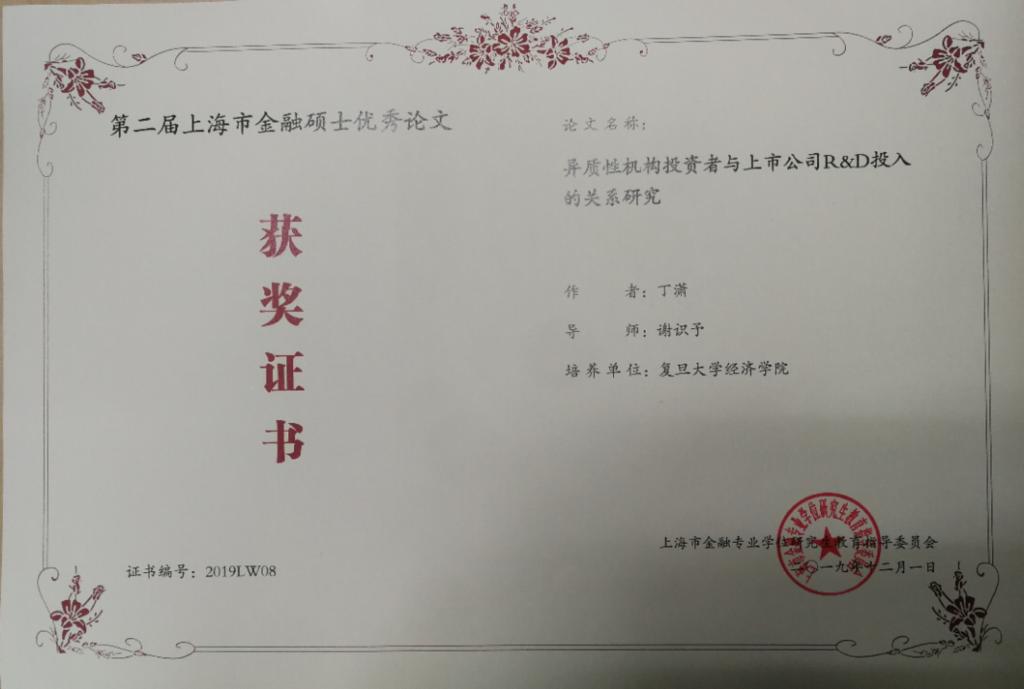 谢识予老师指导丁潇同学撰写的《异质性机构投资者与上市公司R&D投入的关系研究》在第二届上海市金融硕士优秀论文评选中荣获优秀论文奖。