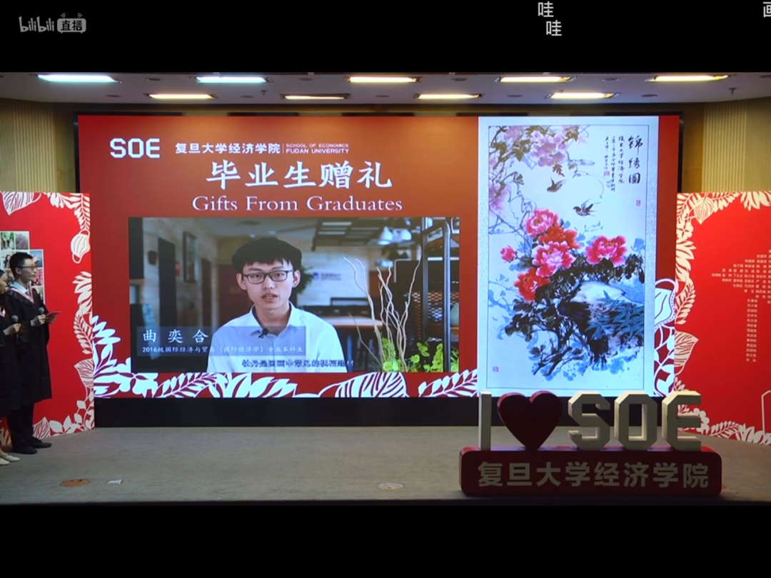 第四篇章名为《情深》,这是同学们向学校和学院诉说真情的时刻。2020届研究生毕业生李雅馨、蒋雨杉带来歌曲《最初的梦想》,娓娓道来初见时的惊喜和离别时的不舍。与此同时,毕业生们也积极参与线上互动——“经生未忘之情”,纷纷用弹幕讲述属于自己的复旦记忆。