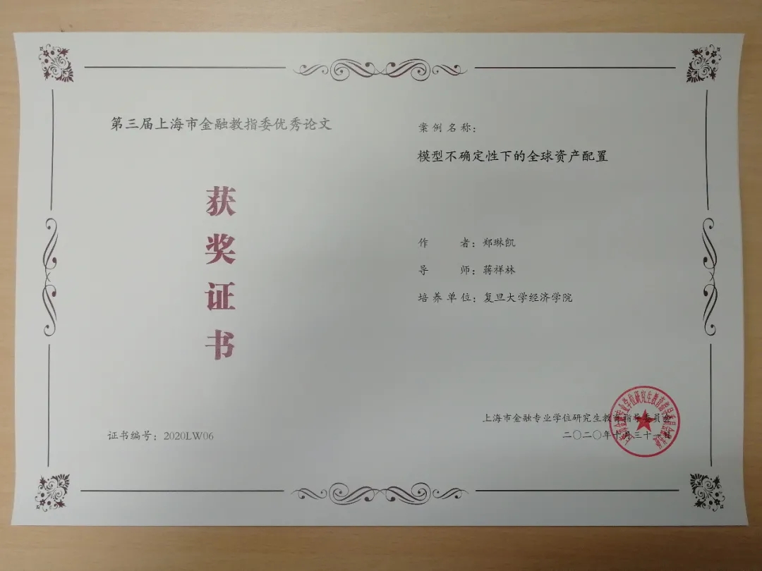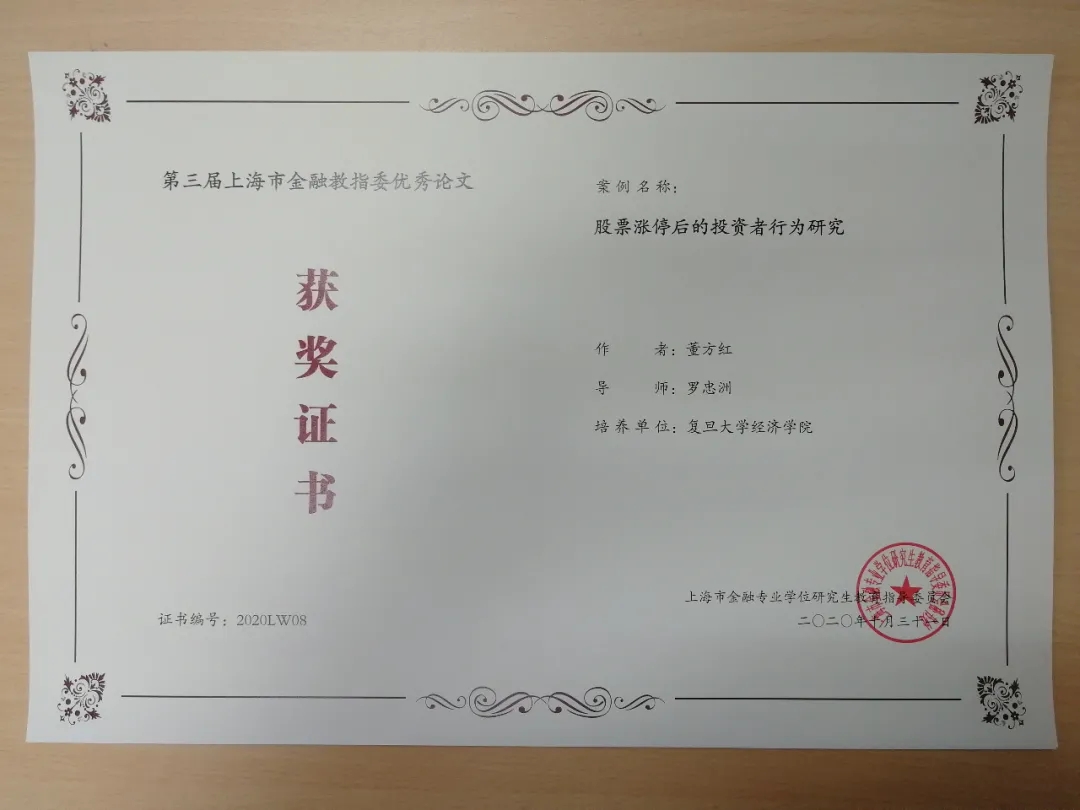 bat365在线登录网站注册赠送36由宋军老师指导王禹涵同学撰写的《基于Barra模型的上市公司净经营资产因子及投资策略研究》,蒋祥林老师指导郑琳凯同学撰写的《模型不确定性下的全球资产配置》,罗忠洲老师指导董方红同学撰写的《股票涨停后的投资者行为研究》在第三届上海市金融硕士优秀论文评选中荣获优秀论文奖。