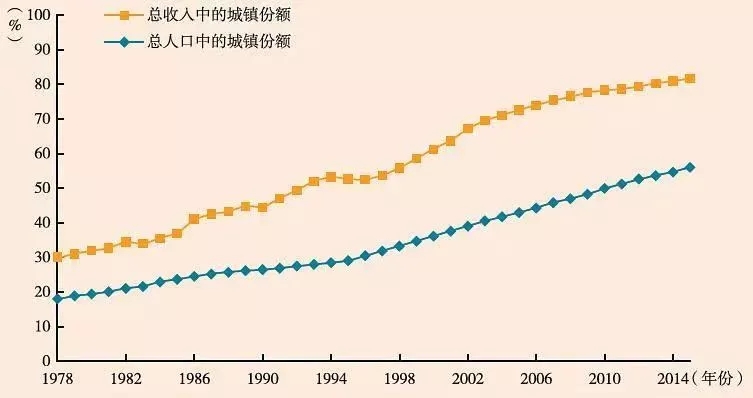图21978-2015年中国城镇人口和收入在全国中的份额