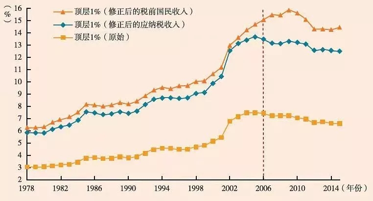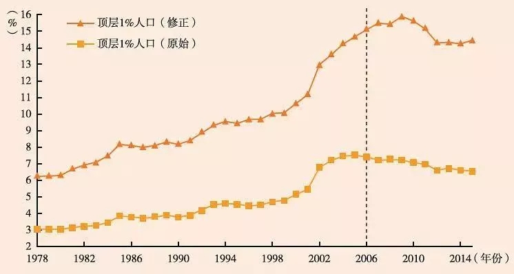 图6中国顶层1%人口的收入份额:修正后的估计与原始估计对比