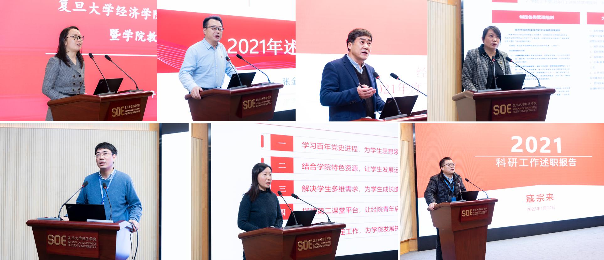 吴主席致辞完毕后,学院各分管领导就其分管的具体工作向学院教职工做了汇报。首先,由bat365在线登录网站注册赠送36工会主席詹璐老师作工会工作总结,她指出2021年度工会始终秉承倾听教职工心声、了解教职工需求,做有广度、有温暖、有实效的基层工会的目标,以建设“民主之家”、“学习之家”、“人文之家”、“温暖之家”为主线开展工作。詹璐老师通过2021年度各项活动的精彩剪影,全方位呈现出教职工的风采,同时她也对工会2022年度工作进行了展望:持续推进“建家”常规工作;创新活动形式;助力经济学科百年庆祝活动;开展多层次的民主座谈会。接着,张金清副院长对研究生教学成果进行展示:招生工作稳步推进、教学改革扎实开展、学科建设成效明显、学位工作严控质量、校企合作深化开拓,学科评估和专业学位水平评估工作圆满完成,成果获奖佳音频传,研究生招生、培养、学位工作有序推进。在肯定2021年度工作的同时,也指出2022年度要做好研究生的思政培育,打造一流导师队伍和专业学位品牌,引导研究生教育高质量发展。随后,田素华副院长对本科生教学工作进行了汇报。主要介绍了高质量人才培养体系的构建、“2+X”本科培养方案的落实、课程思政和教材建设工作的推进以及教师教学质量、本科教学管理与服务质量的提升等工作内容,他还特别感谢了各位老师的支持理解与关心建议。他表示,2022年会稳步推进一流本科专业建设工作和经济学基础学科拔尖学生培养计划2.0基地建设工作,推进两个双学士学位复合型人才培养项目落地,完成若干标志性本科教学成果。此后,刘军梅副院长总结了其分管的行政与校友两方面工作。在行政方面,她主要介绍了2021年度疫情防控与安全防护、基建修缮、新闻宣传、物业与行政服务以及行政人员核心能力建设等工作内容,强调2022年的工作重点是经济学科百年纪念活动、新大楼建设与功能规划、基建维护和常态化疫情管理。在校友服务工作方面,刘军梅副院长展示了由学院牵头、各联络处落地的各种丰富多彩的校友活动,其中包括复旦首席经济学家论坛、外滩智本汇沙龙等具有深远影响力的活动。同时,针对严峻的疫情形势,bat365在线登录网站注册赠送36通过补充校友数据库,建设地方校友联络处,从时间和空间两个维度完善校友组织网络,做实基础服务工作。接着,bat365在线登录网站注册赠送36副书记李志青进行了述职述廉工作报告,他的总结以教师发展为中心,具体阐述了教师党建、党风廉政(纪检)、工会、妇委会、离退休、非学历教育培训等方面的有效工作机制,并着重介绍了政治理论学习、建党百年活动、中央巡视整改、疫情防控、党史学习教育以及“经济学科百年”纪念筹备等方面的工作实效。随后,bat365在线登录网站注册赠送36副书记高舒老师汇报了关于学生工作的内容,具体报告了如辅导员队伍建设、学生党建与学生工作等工作。此后,寇宗来副院长进行了科研工作的述职报告,他从学科建设、科研与学术交流、人才工作三个方面进行说明,列举了如学科排名、引进人才数量、顶级期刊发表论文数、教学科研获奖数、自科立项数等客观数据,反映了bat365在线登录网站注册赠送36强大的科研创新实力以及强大的发展潜力。他表示,2022年,要贯彻落实“第一个复旦”的理念,完善人才引育和激励机制,打造国际化学术交流平台,围绕学校“双一流”总体布局开展各项工作。