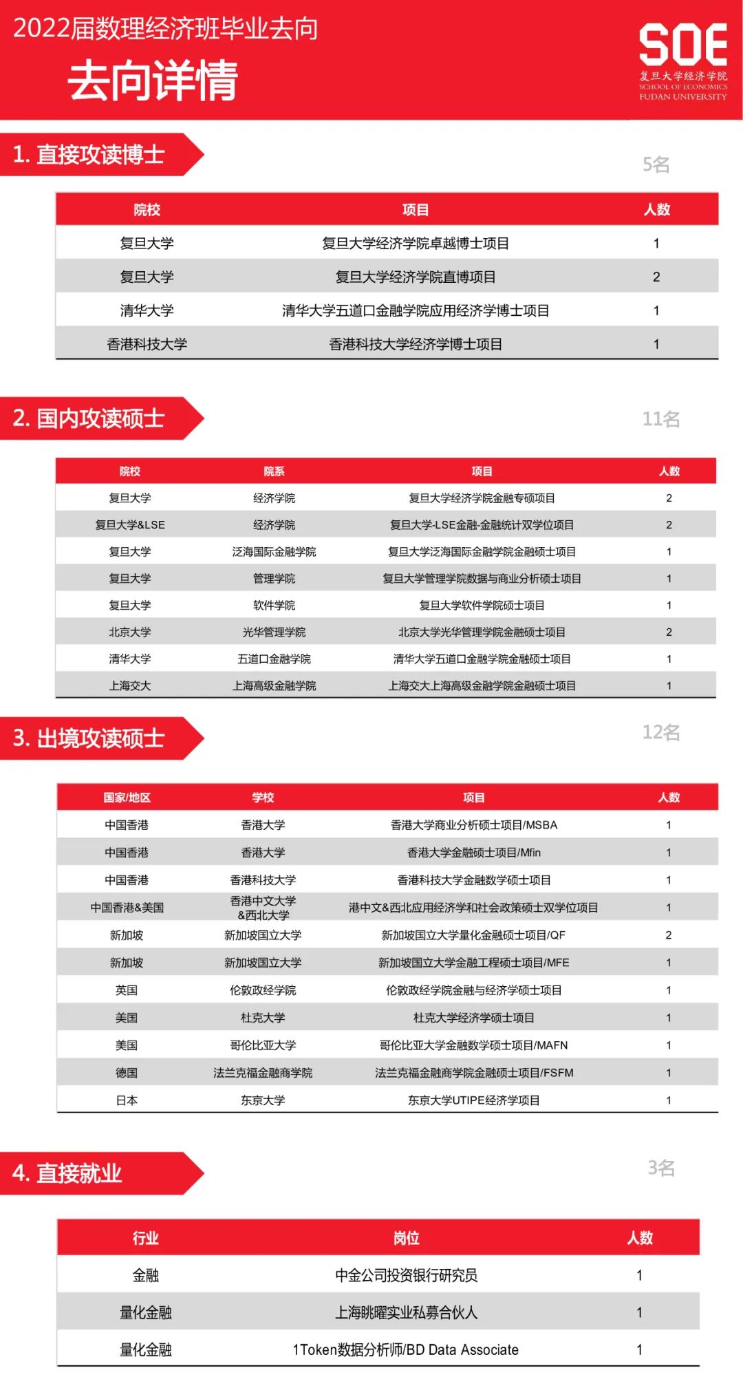 境内深造的同学们星缀京沪,去向包括清华大学五道口金融学院、北京大学光华管理学院,复旦大学卓博项目和直博项目,复旦-LSE双学位项目、bat365在线登录网站注册赠送36、泛海国际金融学院、管理学院和软件学院,以及上海交通大学高级金融学院等多个硕士项目。境外深造的同学们则将走遍世界,去向包括哥伦比亚大学、杜克大学、西北大学、伦敦政治bat365在线登录网站注册赠送36、法兰克福大学、东京大学、新加坡国立大学、香港大学、香港科技大学、香港中文大学等。同学们在申请境外项目时还收获了来自芝加哥大学、加州大学、卡内基梅隆大学、威斯康星大学、宾州州立大学、南洋理工大学等名校的各类硕士项目的offer。此外,选择业界奋斗的同学们亦是中流击楫,其中乃有私募合伙人、中金公司投行研究员、1Token数据分析师。