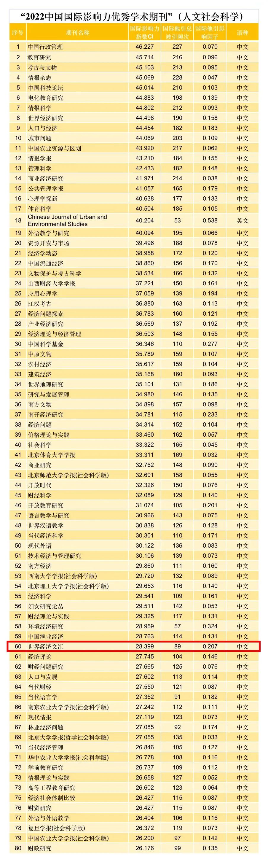 《世界经济文汇》连续三年入选“中国国际影响力优秀学术期刊”(人文社会科学),且在2022年排名进步显著。