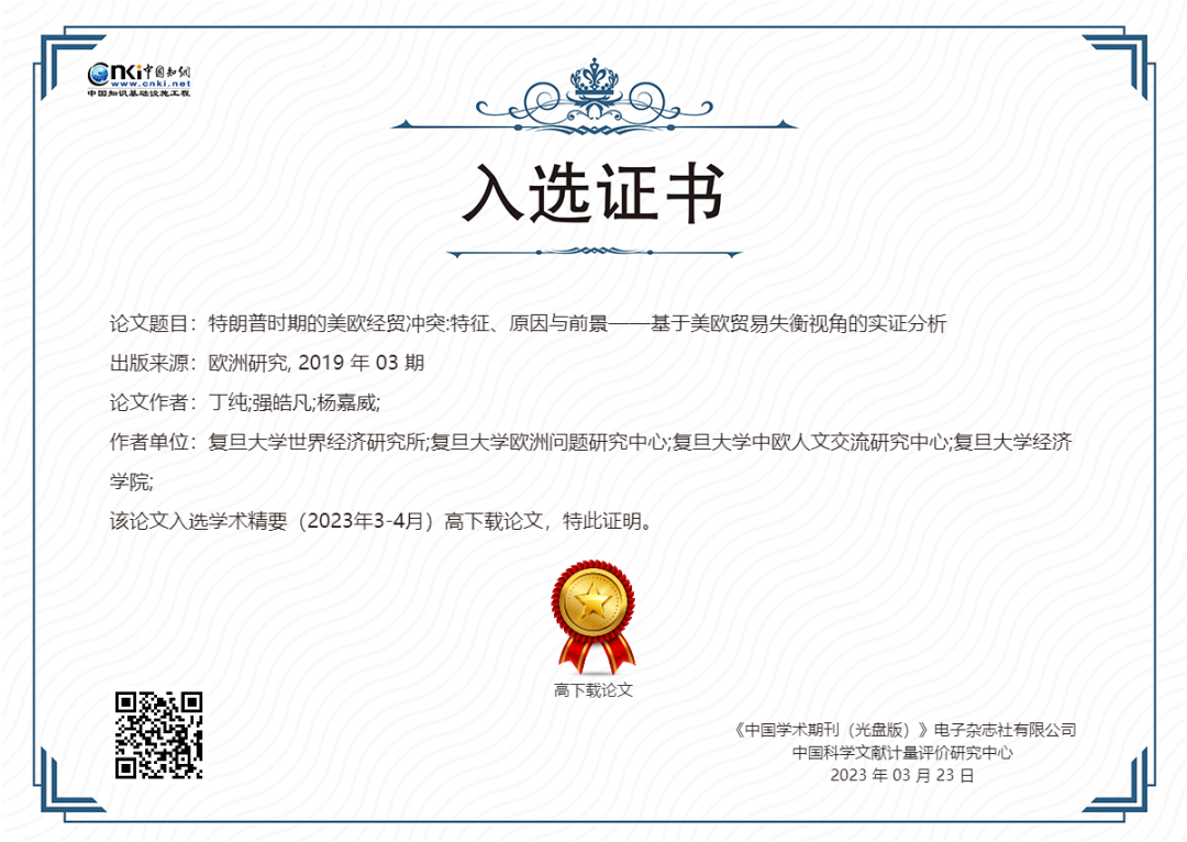 近日,被称为“中国的ESI数据库”的中国知网学术精要数据库发布了2011年以来的高影响力论文。bat365在线登录网站注册赠送36丁纯教授的合作论文《特朗普时期的美欧经贸冲突: 特征、原因与前景——基于美欧贸易失衡视角的实证分析》(发表于《欧洲研究》2019年第3期)入选中国知网学术精要数据库(2023年3-4月)高下载论文。目前已被下载4700余次。