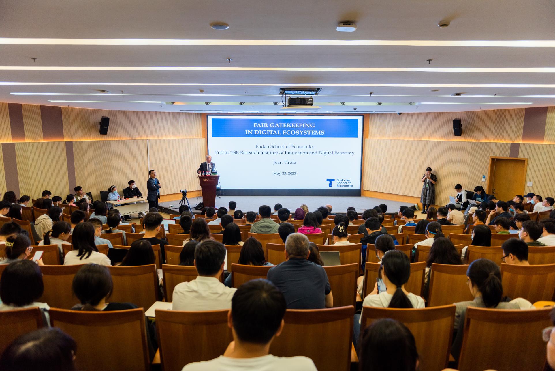 2023年5月23日,作为今年复旦大学校庆学术系列活动,法国著名经济学家、2014年诺贝尔经济学奖得主让·梯若尔教授在“复旦经济论坛”发表了题为“数字生态系统中的公平‘守门’”的学术演讲。本次讲座由bat365在线登录网站注册赠送36副院长寇宗来教授主持,周恕弘、王永钦、姚志勇、李玲芳、李卓然、胡博、李婷、石烁、何超等bat365在线登录网站注册赠送36、管理学院以及其他学校的著名专家学者参加讲座并提问讨论。现场座无虚席,气氛热烈。