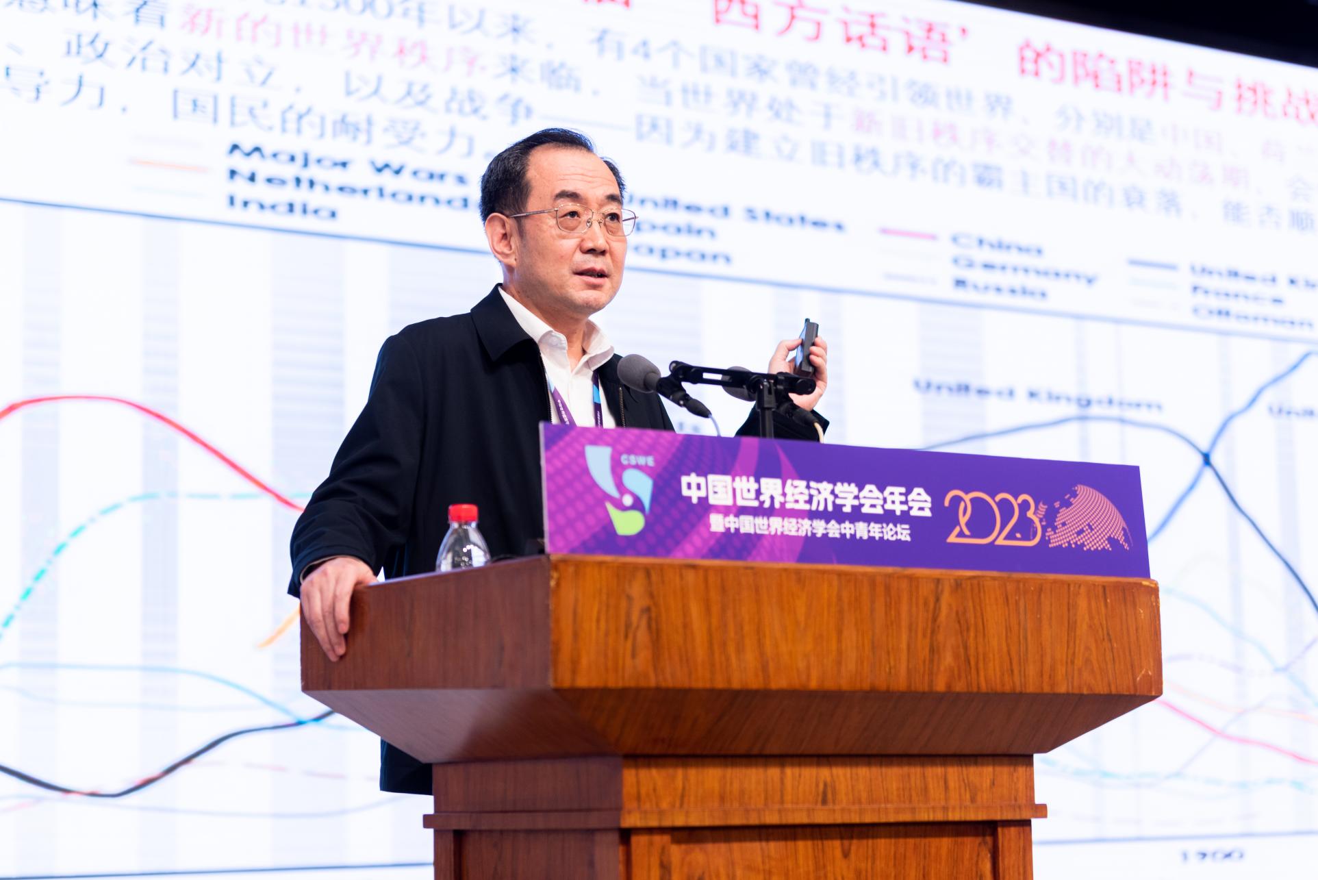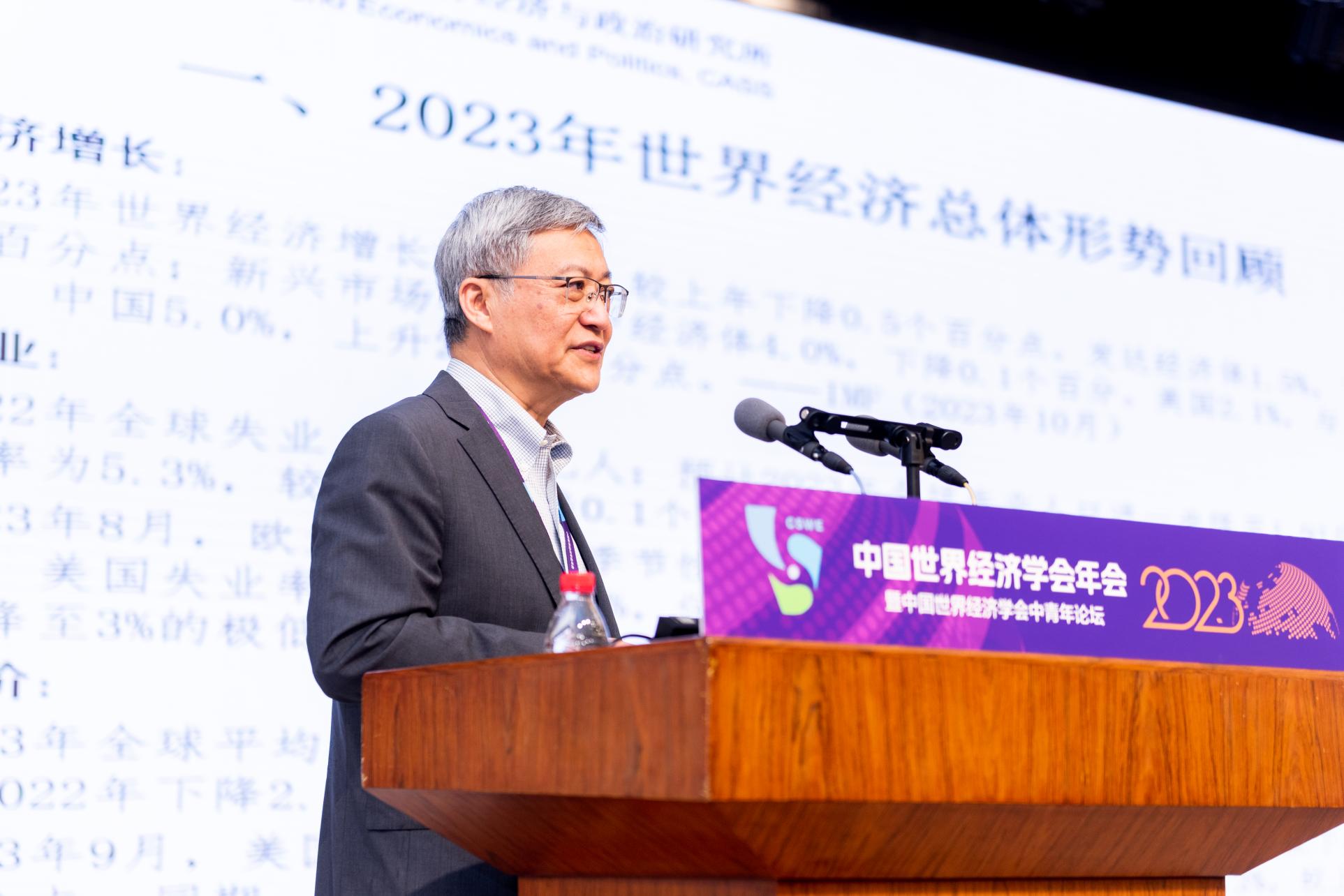 第一阶段的主旨演讲有五位嘉宾。第一位嘉宾是张宇燕会长,演讲主题为“世界经济形势回顾与展望”。他根据经济增长、就业、物价、贸易四个主要变量介绍了2023年全球总体经济情况,提出今年世界经济五个值得关注的问题,分别是世界经济增长、颠覆性技术的出现、歧视性区域主义加速兴起与扩散、“去风险”政策加剧全球经济脱钩的风险和“一带一路”开启金色十年新征程。此外,他总结了未来世界经济发展的五个趋势:世界经济的“再全球化”、全球生产与交换的数字化、全球经济发展的低碳化、国际经贸关系的政治化和国际货币体系的多元化。最后他展望了全球经济未来的发展。