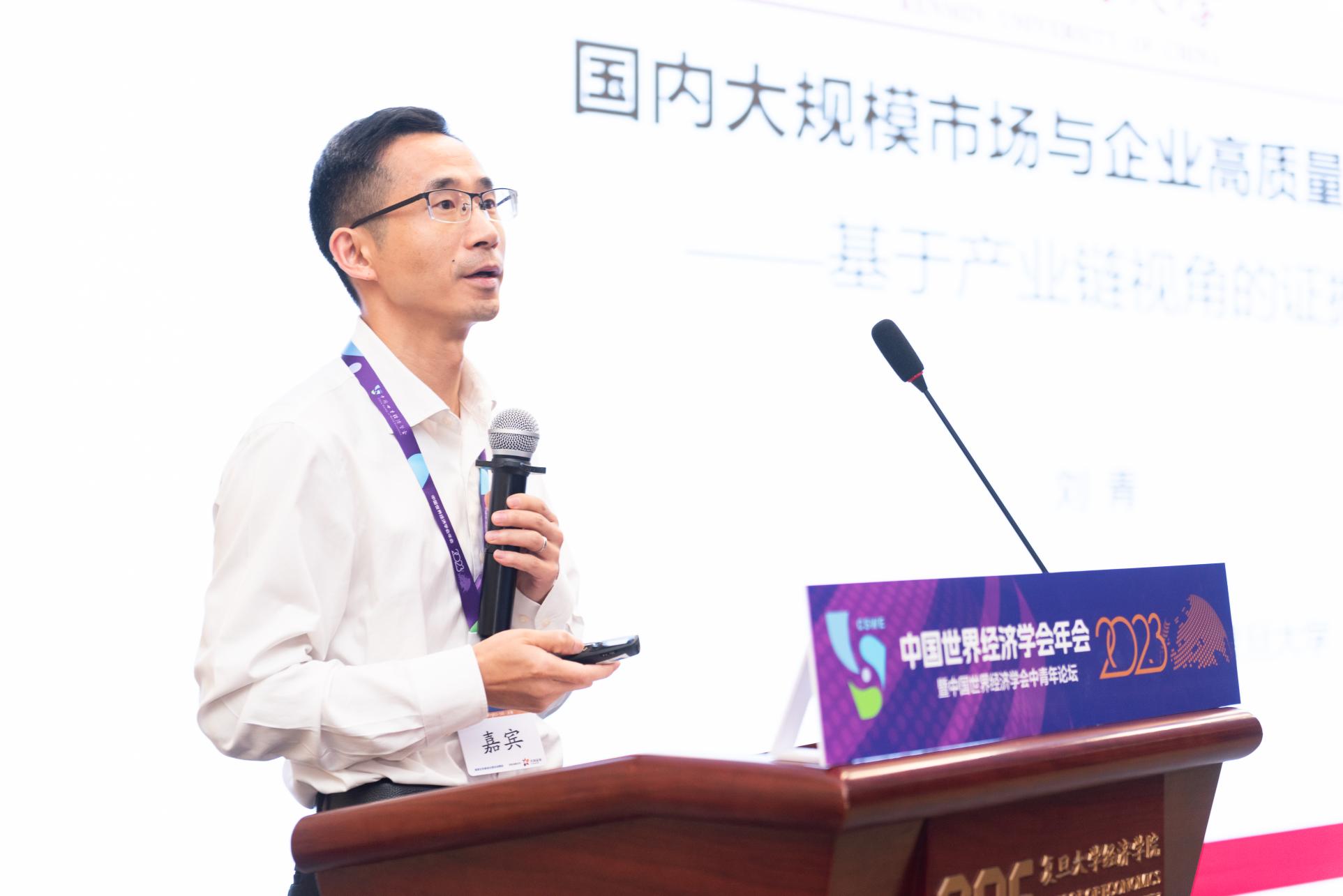 第三位嘉宾是中国人民大学国家发展与战略研究院副院长、中国世界经济学会副会长刘青教授,演讲主题为“国内大规模市场与企业高质量发展”。他向大家介绍了近期的研究工作:从产业链视角构造识别策略,考察国内大规模市场和企业高质量发展之间的因果关系。