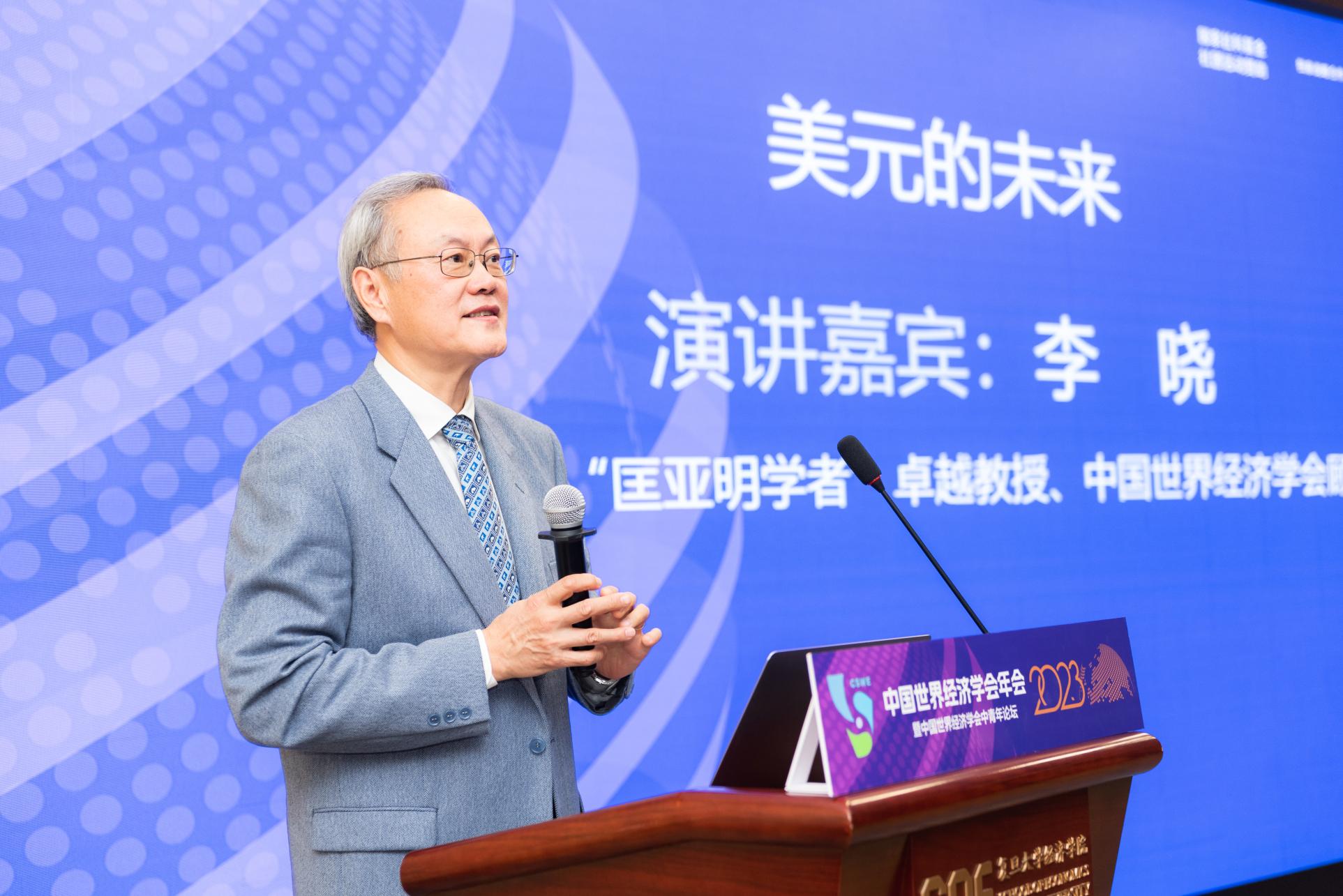 第三位嘉宾是吉林大学“匡亚明学者”卓越教授、中国世界经济学会顾问李晓教授,演讲主题为“美元的未来”。他表示在相当长的时期内,美元的未来取决于美国自身发展的诸多有利因素与矛盾之间的博弈。他指出了美元面临的四个方面的问题,并提出当前关于货币国际化的经济学研究要包含理论逻辑、数据与计量、历史经验,三个方面缺一不可。