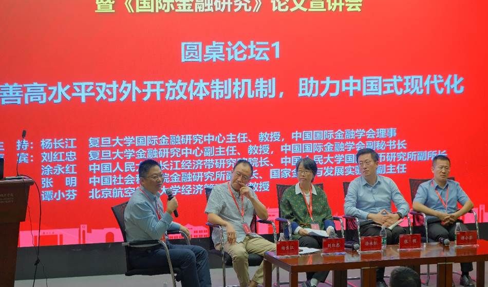 “完善高水平对外开放体制机制,助力中国式现代化”圆桌论坛由复旦大学国际金融研究中心主任、中国国际金融学会理事杨长江主持,复旦大学金融研究中心副主任、中国国际金融学会副秘书长刘红忠,中国人民大学长江经济带研究院院长、中国人民大学国际货币研究所副所长涂永红,中国社会科学院金融研究所副所长、国家金融与发展实验室副主任张明,北京航空航天大学经济管理学院教授谭小芬围绕论坛主题展开深入探讨。几位专家分别从为居民资产全球化配置提供制度保障、企业跨境人民币需求对推动人民币国际化的影响、加快服务业对外开放、全球因素影响下跨境资本流动大幅波动及其风险应对等分享了观点。