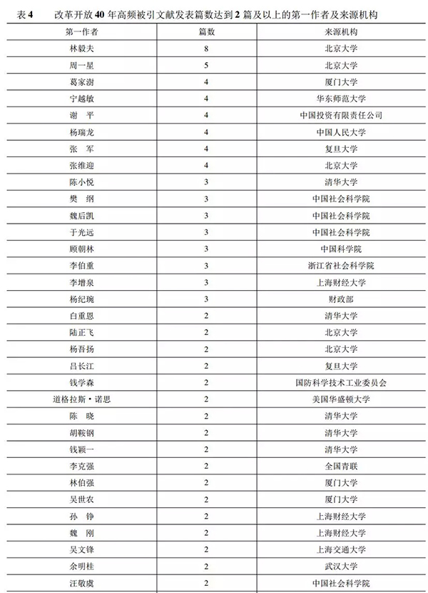 张军教授位列改革开放以来经济学类高频被引文献第一作者被引频次总量排名前三