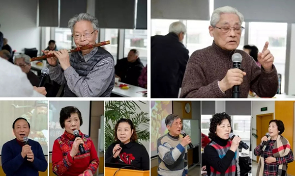 随后,各位离退休老师积极参与,热烈互动,表演了风格各异,富有特色的精彩节目。尹伯成老师表演的笛子独奏《看天下劳苦大众都解放》(《洪湖赤卫队》选曲)、吴顺妹老师和叶云文老师合唱的《红尘情歌》、马莉娟老师和赵玉珍老师合唱的沪剧《问紫娟》(《红楼梦》选段)、施正康老师演唱的英文歌曲《You Are My Sunshine》,焦必方老师演唱的日语歌曲《酒よ》、徐培华老师演唱的京剧《三生有幸》(《追韩信》选段)。老师们一曲接着一曲,高潮迭起。会场欢声笑语,充满浓郁的节日气氛。最后,联欢会的表演部分在周振汉老师男高音专业水准的清唱《千条船万条船》和赵玉珍、王志红老师联袂深情并茂的沪剧《盘凤》演唱声中落下帷幕。