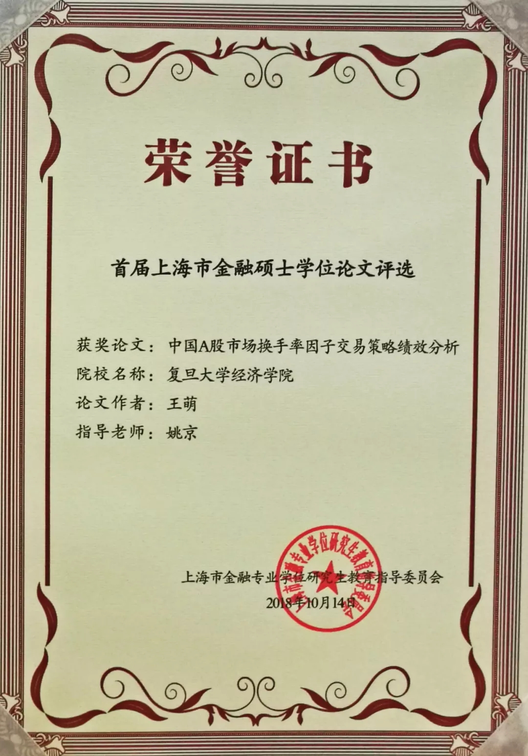 10月14日,2018年上海市金融专业学位研究生教育指导委员会培养单位工作会议在上海财经大学金融学院举行。会中传来喜讯,bat365在线登录网站注册赠送36陈诗一教授指导2015级金融硕士研究生肖锋撰写的学位论文《基于50ETF期权波动率指标的择时策略》、姚京副教授指导2015级金融硕士研究生王萌撰写的学位论文《中国A股市场换手率因子交易策略绩效分析》获评首届上海市金融教指委论文大赛优秀论文。