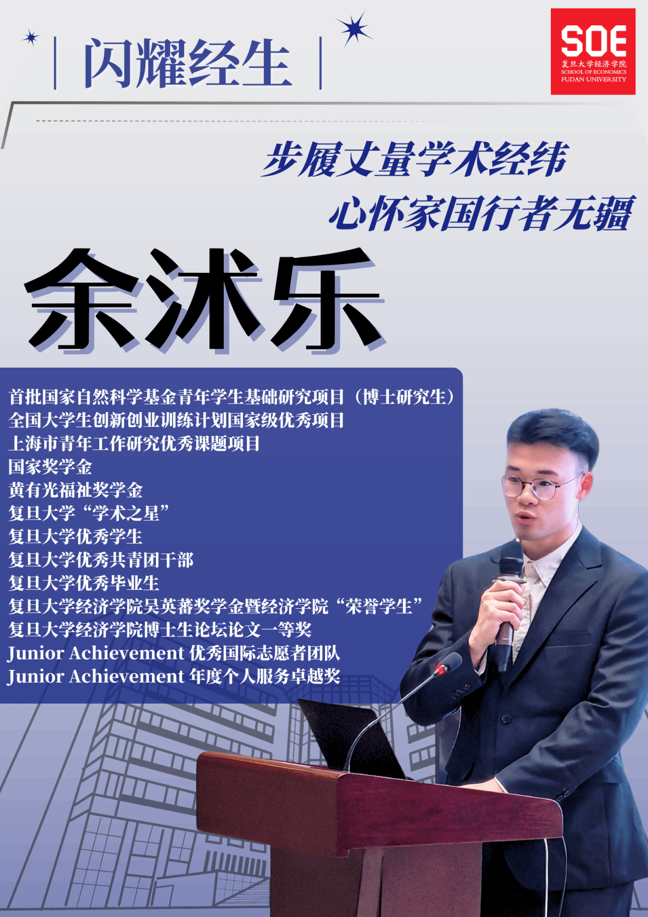 余沭乐,bat365在线登录网站注册赠送36西方经济学专业2020级直博生,师从张军教授。复旦大学优秀毕业生,第十六届复旦大学“学术之星”(特等奖提名),国家奖学金、黄有光福祉奖学金、吴英蕃奖学金等多项荣誉获得者。他深耕人工智能与劳动力市场研究前沿,足迹跨越学术高峰与社会实践,以“行者”姿态诠释新时代复旦经院人的责任与担当。