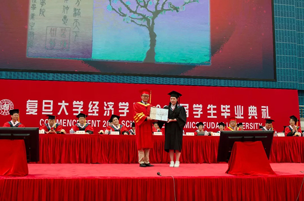 随后,是隆重的学位授予仪式。伴随着《复旦大学校歌》就座在主席台的教师们为全体毕业生授予学位,并颁发毕业纪念册。毕业生学位帽上的流苏从右侧拨到了左侧,标志着他们顺利完成学业,即将离开校园,奔向更加广阔的天地。