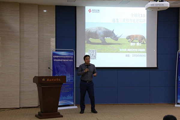 开幕式后,“世界经济专题”学术论坛在广西财经学院行政楼一楼学术报告厅进行,该专题论坛由孙杰研究员主持,南开大学周申教授、湖南大学祝树金教授、复旦大学干杏娣教授担任评议人。复旦大学华民教授、重庆大学(诺丁汉大学)姚树洁教授、南开大学李坤望教授、上海财经大学丁剑平教授、复旦大学田素华教授、宁波大学钟昌标教授、东方证券首席经济学家邵宇博士分别作了精彩的会议报告。