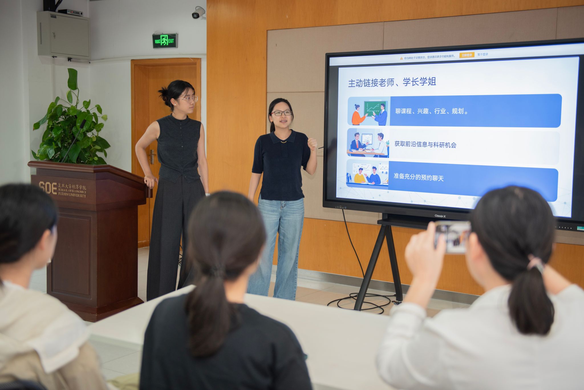 最后,她们建议同学们在学习之外探索生活的各个方面,未来在学习、生活、工作和爱好中追求平衡和完整,做到“文明其精神,野蛮其体魄”,成为“卓越而有趣”的复旦人。