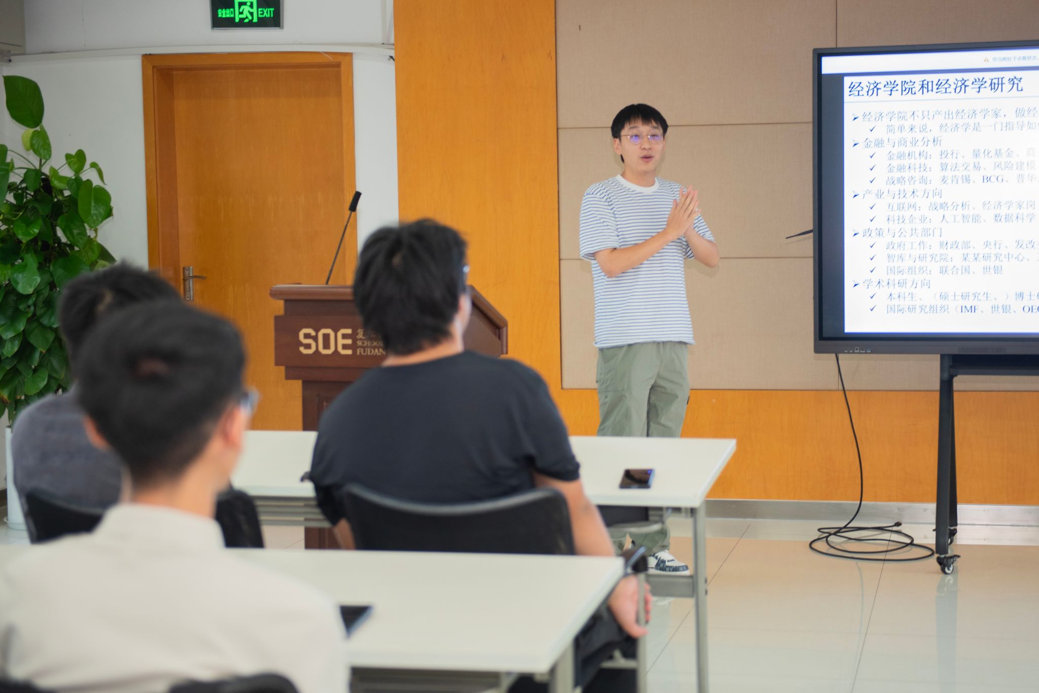 2023级数理经济班的大三学长陆昊则从“学术研究是什么”、“如何接触学术研究” 以及“如何平衡多项发展”等多个角度,向同学们深入剖析了应当如何抉择是否要走上学术研究的道路,以及学术研究对个人成长和对社会贡献的作用和意义,为同学们大学生涯的理性规划和路径选择提供了宝贵指引。
