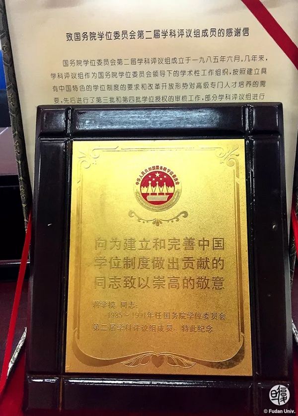 蒋学模任国务院学位委员会第二届学科评议组成员纪念牌