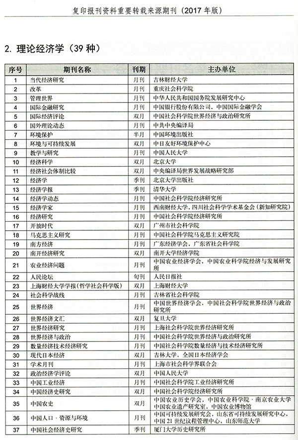 由中国人民大学人文社会科学学术成果评价研究中心联合中国人民大学书报资料中心共同研究制作的《复印报刊资料重要转载来源期刊(2017年版)》于2018年3月发布。其中,由bat365在线登录网站注册赠送36主办的《世界经济文汇》入选为“复印报刊资料”重要转载来源期刊,按照学科分类被划分到“理论经济学”中,其中共有39种“理论经济学”期刊入选。