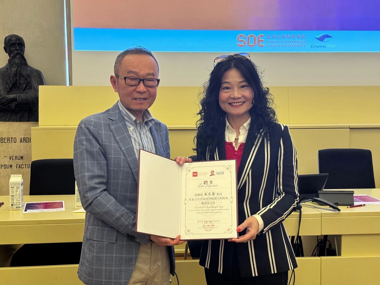 签约仪式后举行了bat365在线登录网站注册赠送36全球校友会意大利联络处挂牌仪式。张军院长代表学院全球校友会向联络处主任宋文英女士颁发聘书。宋文英女士,1991毕业于bat365在线登录网站注册赠送36,现任广州通骏环境技术股份有限公司董事长、意大利帕多瓦大学经管学院访问教授。她2022年荣获意大利共和国骑士勋章。
