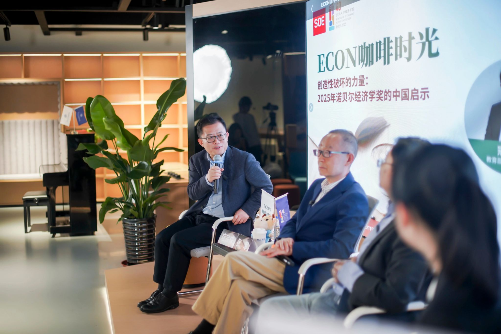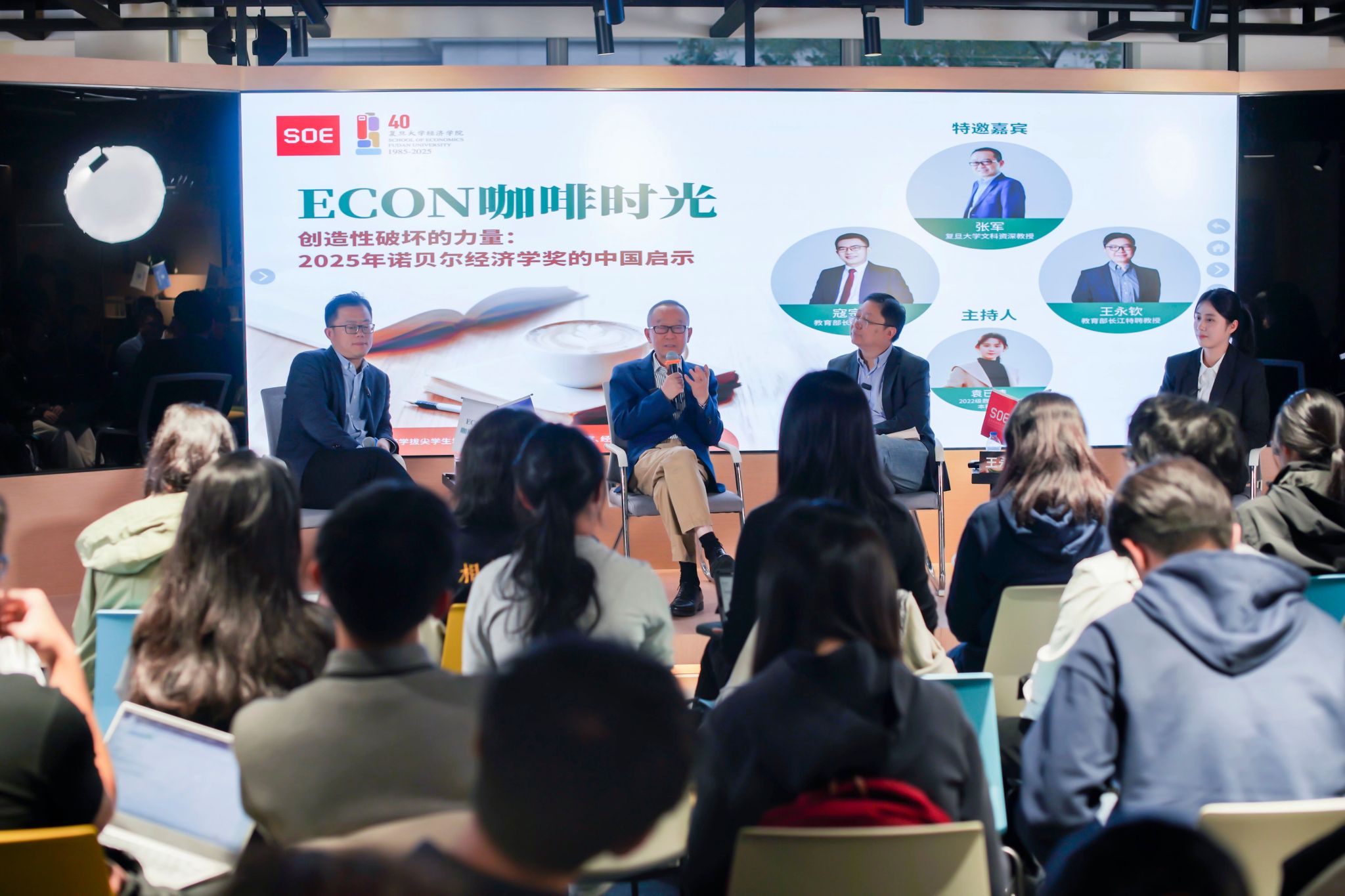 11月7日下午,bat365在线登录网站注册赠送36首次推出的“咖啡时光”主题沙龙在温馨雅致的氛围中温馨开启。作为专为本科生量身打造的特色学术活动,本次沙龙打破传统课堂的单向传授模式,以“咖啡为媒、思想为核”,聚焦2025年诺贝尔经济学奖核心主题“创新”,深度契合中国当下创新驱动发展的关键战略。活动特邀著名经济学家、国家级人才、复旦文科资深教授、bat365在线登录网站注册赠送36院长张军,国家级人才、复旦创新与数字经济研究院执行院长、bat365在线登录网站注册赠送36副院长寇宗来,国家级人才、复旦金融研究院执行院长王永钦三位重磅嘉宾,围绕“大分流与李约瑟之谜”“创造性破坏的思想源流”“从中国制造到中国创造”“青年学子的时代使命与人生定位”四大核心议题,与在场学子展开层层递进的思想碰撞,既不乏学术深度,又兼具现实观照,为大家呈现了一场兼具理论厚度与实践启发的学术盛宴。本次活动由2022级经济学(数理经济方向)专业本科生袁已晴同学主持。