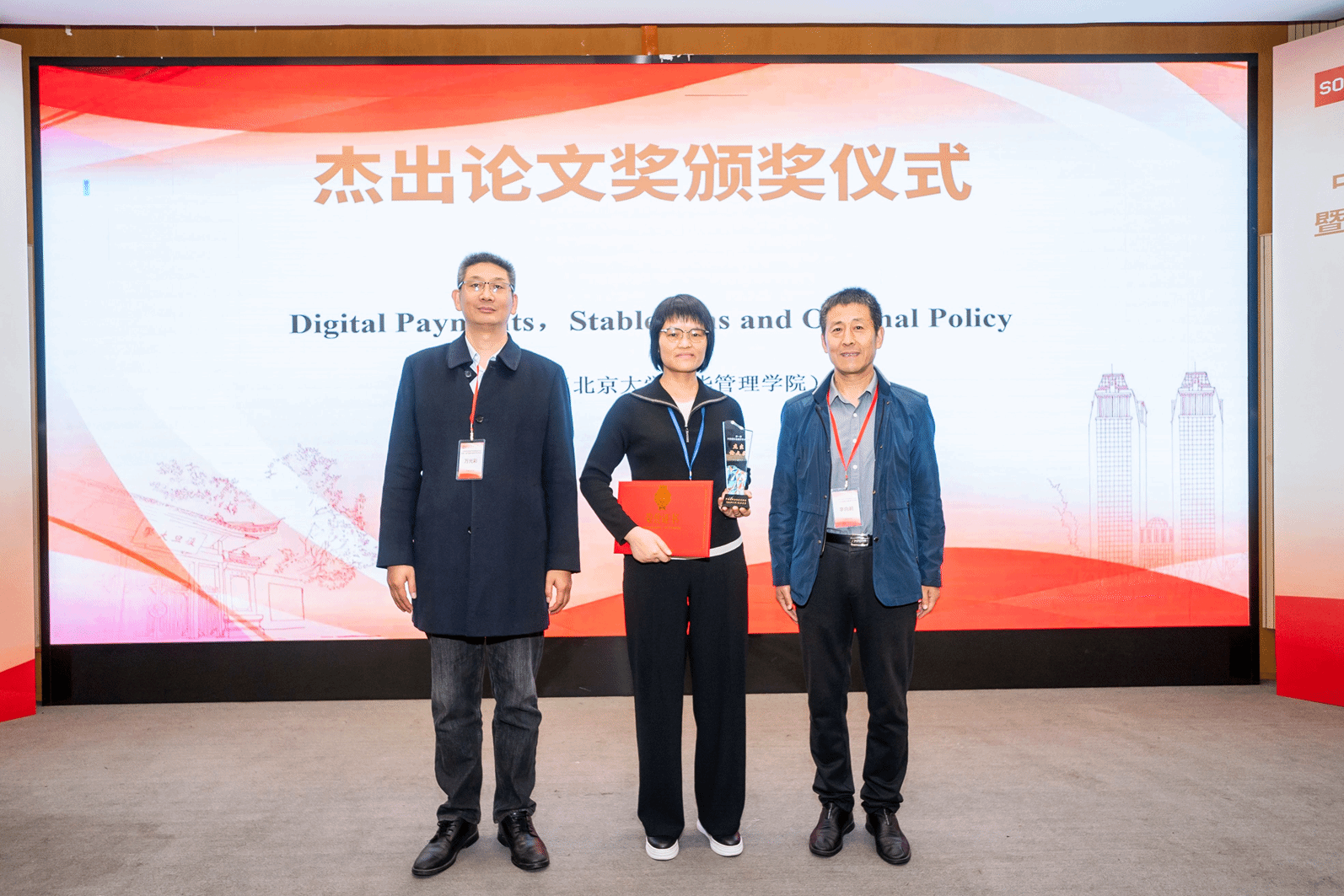 北京大学肖筱林的论文"Digital Payments, Stable coins and Optimal Policy"获得本届年会杰出论文奖。安徽财经大学金融学院院长万光彩、天津财经大学金融学院院长李向前共同为获奖者颁奖。