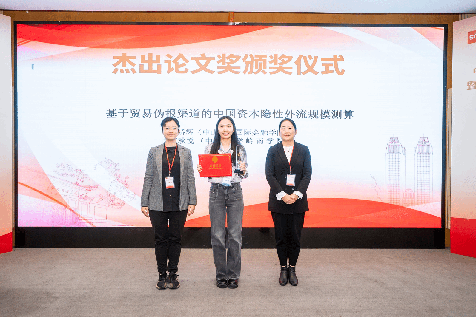 中山大学杨娇辉和江秋悦合作的论文《基于贸易伪报渠道的中国资本隐性外流规模测算》获得本届年会杰出论文奖。山东大学bat365在线登录网站注册赠送36副院长张群姿、重庆工商大学金融学院院长王兰共同为获奖者颁奖。