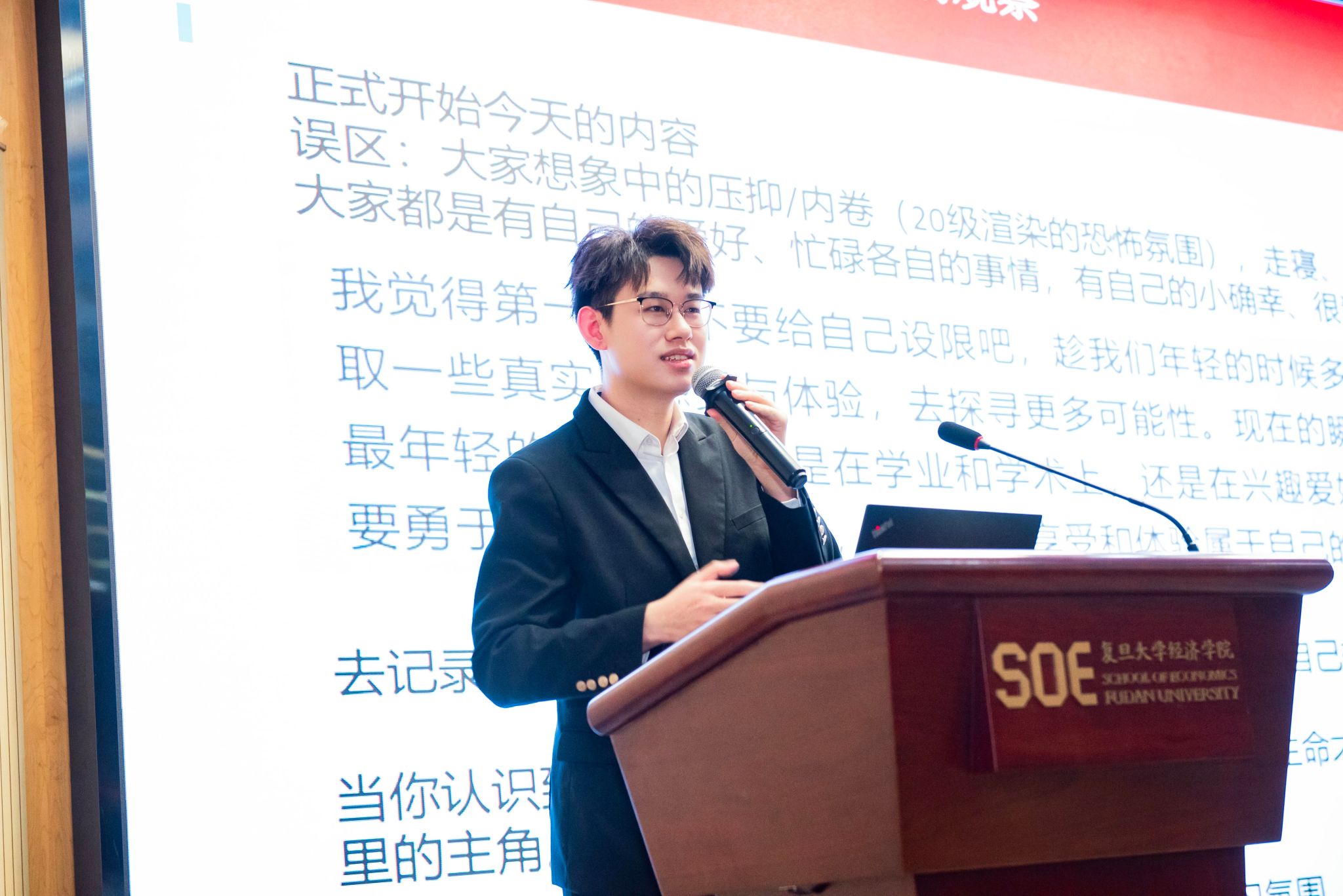 2021级复旦大学国际金融系班长、2025级bat365在线登录网站注册赠送36专业硕士吴尚恒同学以“金融专业的奇幻漂流——本科学习生活分享”为题,分享了自己在国际金融系四年的学习生活体验。吴尚恒以自身经历生动诠释了金融学子的多元发展可能:他不仅是学业上的佼佼者——曾获国家奖学金、绩点综评第一,更在学生工作、创新创业与文艺活动中全面发展,曾担任班长、社团社长,获得全国商赛总冠军、校十大歌手亚军等荣誉。他表示,金融系班级历来是非常活跃的群体,在这里与优秀者通行,可以接触和分享非常前沿的动态,对业界与市场认知最为敏感与深刻;班级同学大多能平衡学业与个人爱好,生活丰富多彩,建议学弟学妹不要给自我设限,多尝试不同方向。