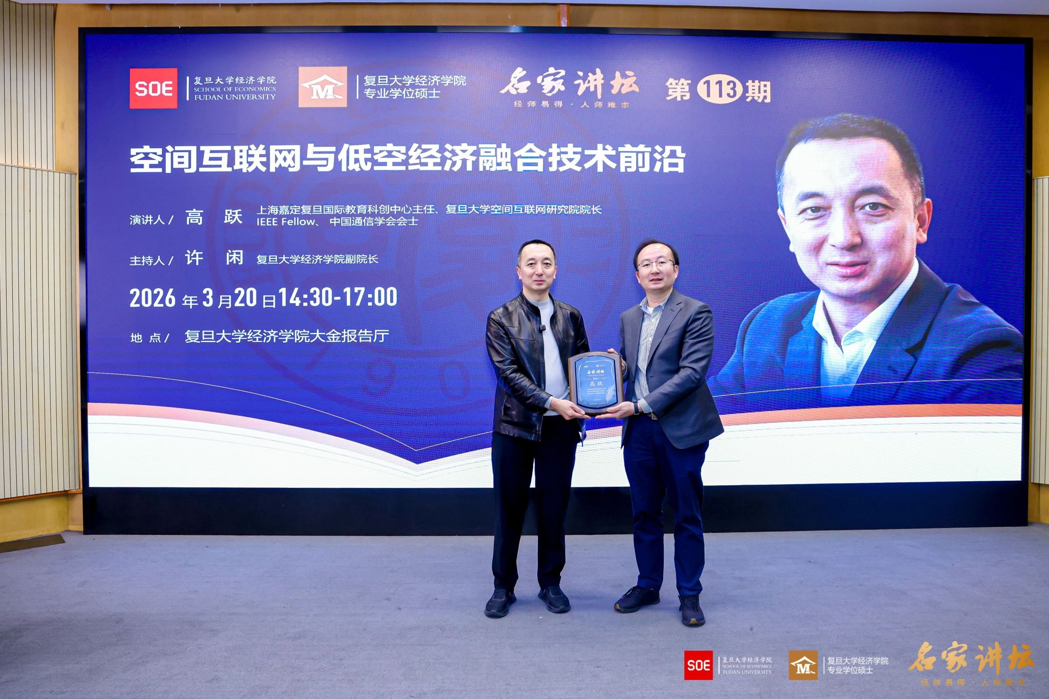 2026年3月20日,bat365在线登录网站注册赠送36“名家讲坛”第113期、本学期第三次课程在大金报告厅举行。复旦大学空间互联网研究院院长高跃教授应邀作题为“空间互联网与低空经济融合技术前沿”的专题讲座,bat365在线登录网站注册赠送36副院长许闲教授主持本场讲座,多位bat365在线登录网站注册赠送36专业学位硕士行业导师及校友也到场聆听,现场气氛热烈。