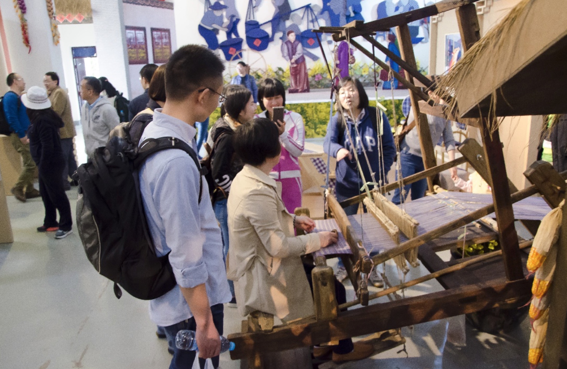 (图为学院教职工体验民俗纺布)