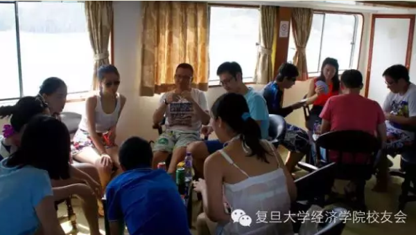 在游船开往沙滩途中,校友们继续互动,K歌能手纷纷献唱,桌游玩家不乏奇招,还有帅哥美女们在游船顶层于海风中谈笑风生。