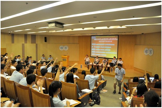 张金清教授首先代表本次夏令营的主办方介绍了在主席台上就座的各位领导、嘉宾,随后向营员简短说明了报告、座谈会的目的和方式:围绕着本次夏令营的面试以及未来在复旦读书、实习、就业的各个方面,与会营员可以向嘉宾提出问题,进行互动。作为开场白,五位嘉宾向与会同学表示了热情的欢迎和亲切的鼓励:张金清教授首先代表学院对各位营员表示欢迎和美好祝愿;丁国荣教授深情地表示,看到年轻的同学们就仿佛看到了24年前的自己;石磊教授表示同学们的脸庞上仿佛流淌着智慧,希望让智慧更多的表现出来;顾建忠导师回顾自己进入复旦时的经历,鼓励同学们在复旦成长成才;楚永全副教授代表研究生院,表达了希望同学们顺利通过夏令营考核,并且成为优秀毕业生的美好祝愿。在轻松而热烈的气氛中,主持人向与会同学宣布提问开始,同学们踊跃举手发言。