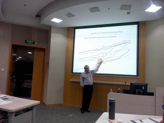 布吉尼翁教授的课程讲解生动风趣,与听讲的学生形成了良好的互动,在整个两个半小时的课程中,教授基于详实的历史数据和扎实的理论,高屋建瓴地从世界范围内为我们展现了增长与不平衡的演化过程,并深入浅出地提出了二者之间的制度联系,并为我们提及当前经济学前沿领域对于制度重要性的研究。特别地,布吉尼翁教授还专门提到了中国经济在过去的30多年里所做出的举世瞩目的成就,并认为中国的发展有其独特之处,不能照搬欧美过去的经验,并对中国经济的未来发展做出了展望。