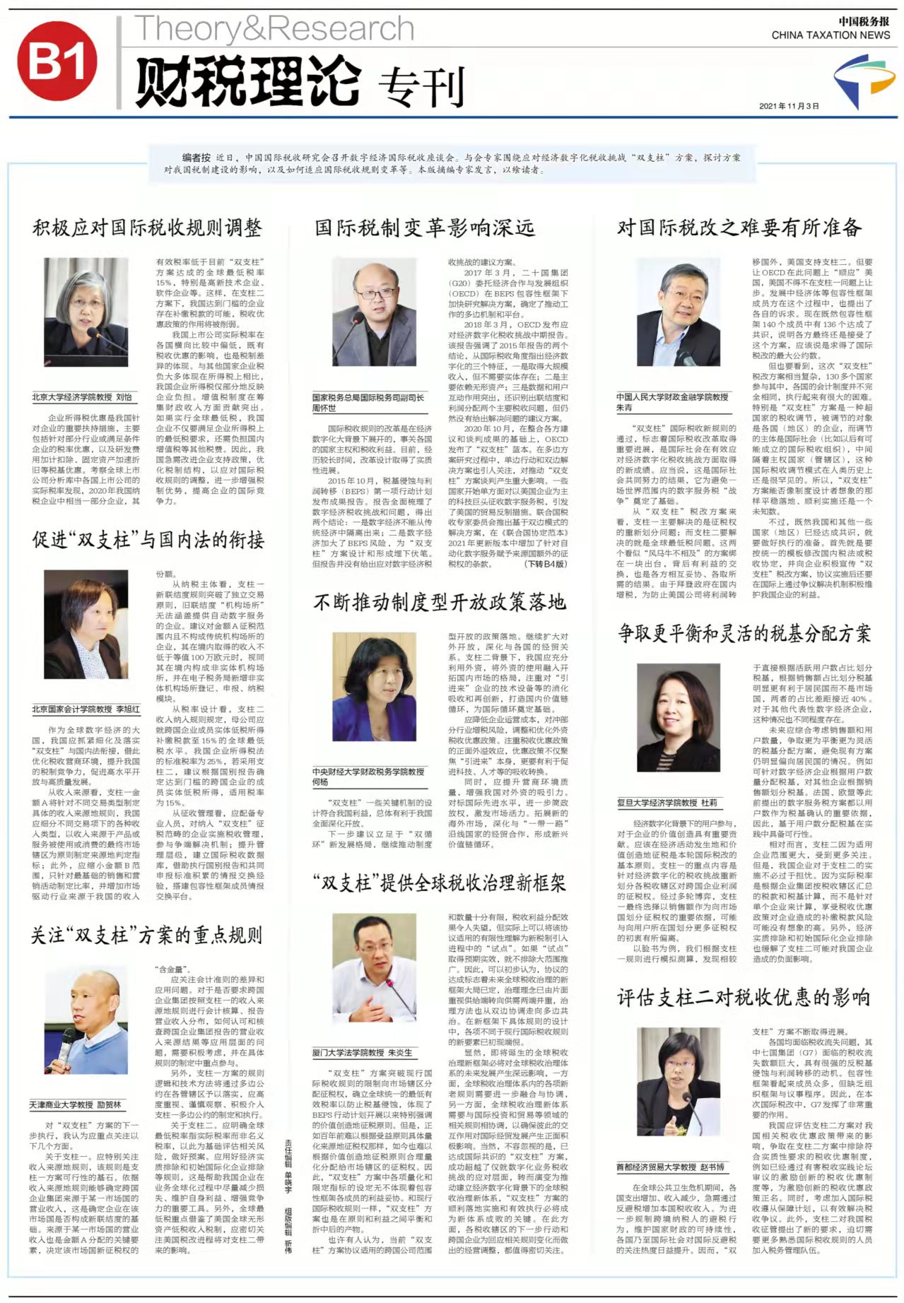 近日,中国国际税收研究会召开数字经济国际税收座谈会,与会专家围绕应对经济数字化税收挑战“双支柱”方案,探讨方案对我国税制建设的影响,以及如何适应国际税收规则变革等。bat365在线登录网站注册赠送36杜莉教授参加座谈会并提出观点。
