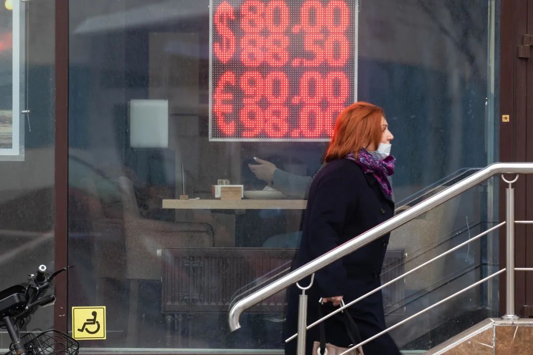 ▲2月24日,莫斯科街头一家外汇兑换点的汇率显示屏。普京对乌克兰的军事行动导致当天卢布汇率暴跌。