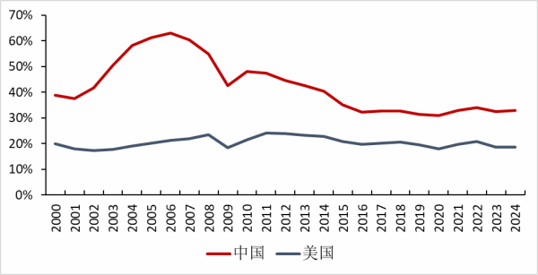 接下来我们先看一下中国的整个贸易规模,特别是货物贸易占GDP的比重,因为中国主要的出口是货物或制成品出口。刚才黄(奇帆)市长谈到了服务贸易,我们等下也会涉及到。首先看进出口货物贸易总额占GDP的比重。从图上可以看到(见下图),我们的贸易规模曾在2006年达到64%的峰值,2024年已降至36%左右。相比之下,美国2024年的进出口货物贸易总额占GDP比重约为25%。