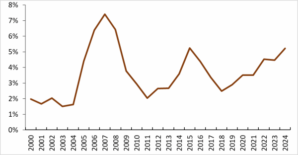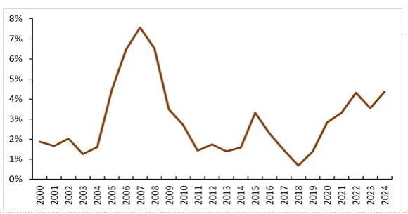 尽管如此,我国依然长期保持较大的贸易顺差。2024年,我国货物贸易顺差接近1万亿美元,占GDP比重超过5%。但是在本世纪初顺差占比相对较低,那个时候大概在1-2%(见下图)。