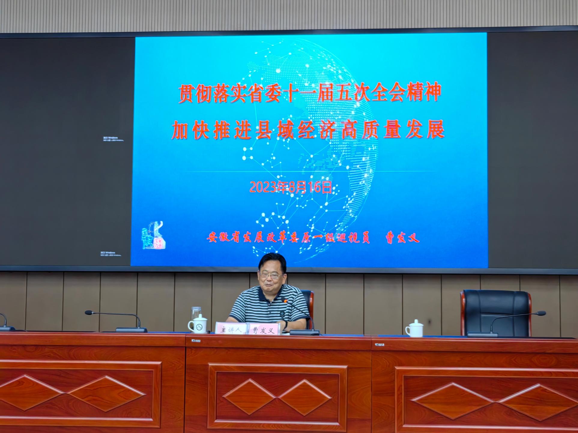 16日下午,三方党委联合举办了“潜岳大讲堂”第二讲,邀请安徽省发改委原一级巡视员曹发义围绕深度融入长三角一体化发展战略、安徽省“三地一区”和“七个强省”建设,从县域经济高质量发展视角,对地方产业全面绿色转型与和美乡村建设进行指导。报告会由潜山市委常委、组织部长产敬春主持。