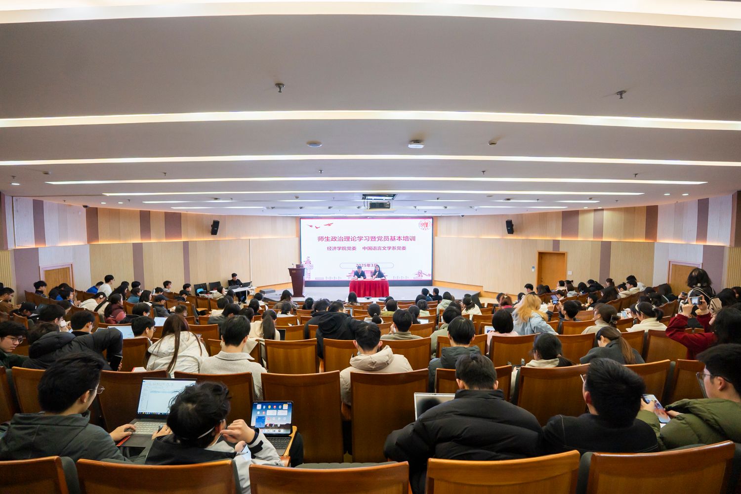 为深入学习贯彻2025年全国两会精神,引导师生把思想和行动统一到党中央决策部署上来, 2025年3月18日,bat365在线登录网站注册赠送36党委与中文系党委携手,于bat365在线登录网站注册赠送36大金报告厅开展师生政治理论学习暨党员基本培训,邀请第十四届全国政协委员、上海中华职教社副主任丁光宏教授做2025年全国两会精神传达报告。会议借助bat365在线登录网站注册赠送36视频号及腾讯会议,实现线上线下同步直播,两院系超千名师生积极参与,线上线下热情高涨。