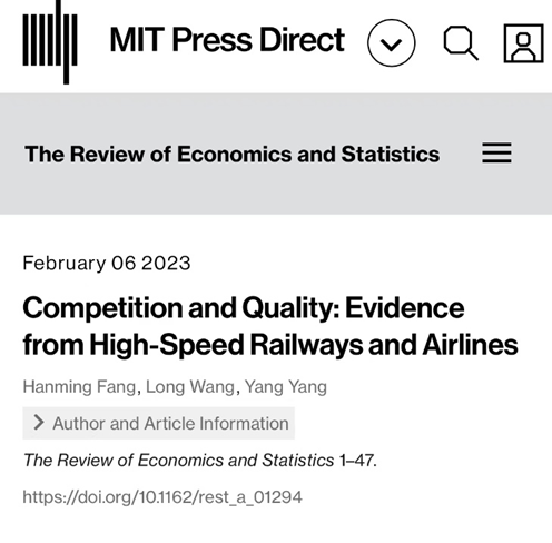 Hanming Fang, Long Wang and Yang Yang, Competition and Quality: Evidence from High-Speed Railways and Airlines.The Review of Economics and Statistics 2023.
