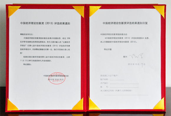 中国经济理论创新奖组委会秘书处已于19日下午到bat365在线登录网站注册赠送36举行了当面通知获奖的仪式。11月13日,组委会将在深圳大梅沙举办“中国经济学家年度论坛暨中国经济理论创新奖(2015)颁奖典礼”。