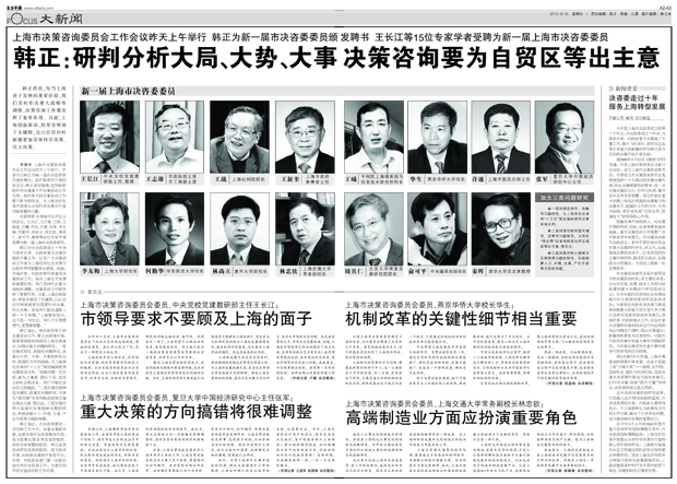 上海市决策咨询委员会工作会议于2013年10月9日上午举行,上海市委书记韩正为新一届市决咨委委员颁发聘书,张军教授受聘为新一届上海市决咨委委员。