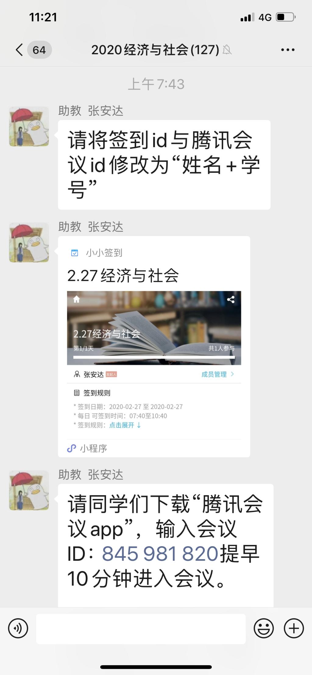2月27日星期四早上7点45分,《经济与社会》课程助教在微信群发送“小小签到”程序,通知同学签到后提早10分钟进入腾讯会议。石磊老师8点准时通过腾讯会议平台进行在线答疑互动,120多位同学同时在线,答疑课分三个环节。石老师首先讲解了《经济与社会课程概论》、然后助教把收集到的课前同学通过视频自学提出的19个问题用共享屏幕的方式在PPT上一一播放,石老师按照问题顺序进行一一解答。同学还在腾讯会议聊天界面即时提出疑惑,石老师继续在线即时有声答疑,同时助教在会议聊天界面进行辅助文字答疑。最后石老师结合同学关于新冠肺炎的疑惑,分析了疫情对中国经济与社会生活的影响,嘱咐大家疫情期间做到不返沪不返校。因为会议时间设定的限制, 10:30过后,讨论转到微信群继续进行,一直延续到12点半。